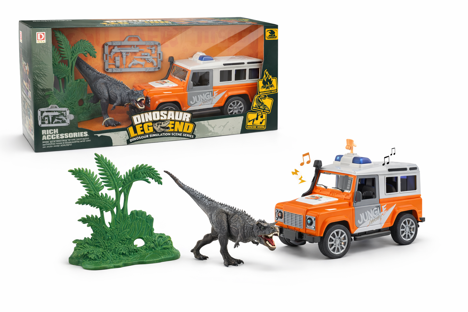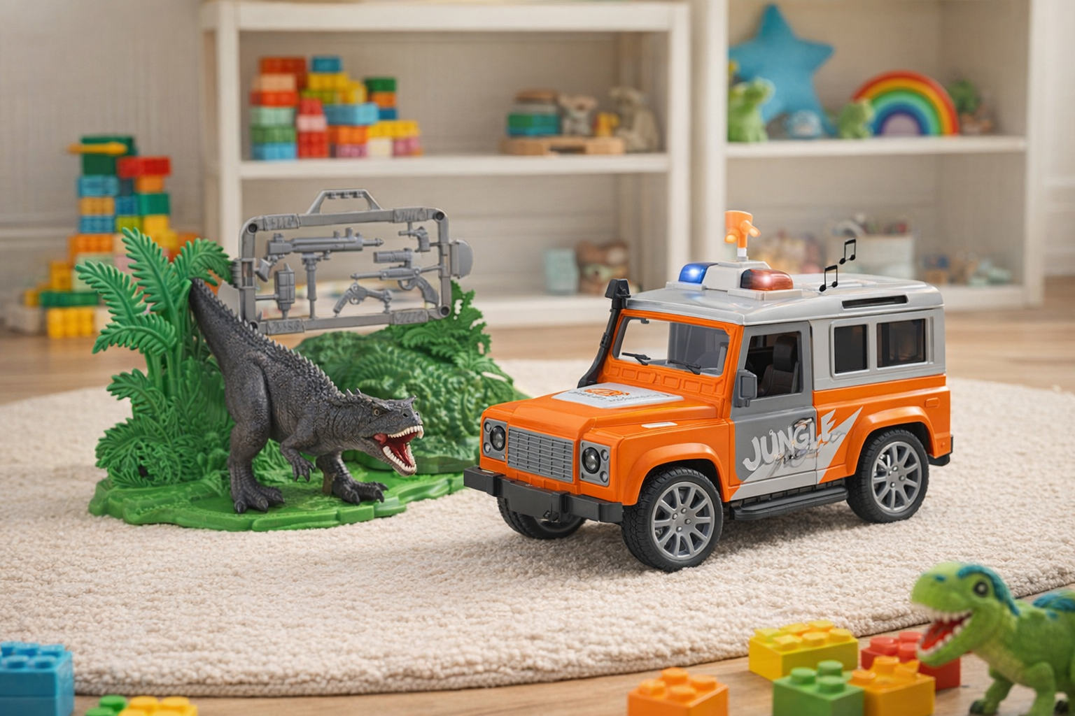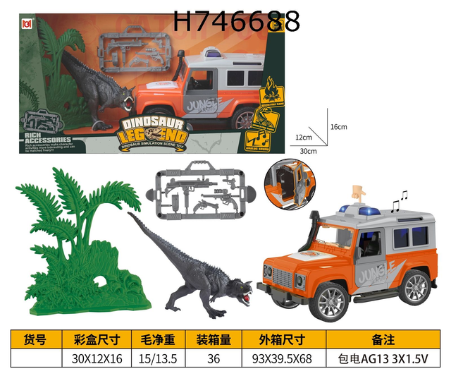 Entdecken Sie die aufregende Welt der Dinosaurier mit diesem abenteuerlichen Spielset, das einen realistisch gestalteten Geländewagen, eine große Dinosaurierfigur und üppige Pflanzen nachbildet. Der orangefarbene Geländewagen, verziert mit einem coolen 'Jungle'-Aufdruck, ist perfekt für spannende Dschungelerkundungen. Kinder können das Auto mit den beweglichen Rädern mühelos durch imaginäre Landschaften manövrieren. Der Dinosaurier und die Pflanzen schaffen eine authentische Urzeit-Atmosphäre, die die Fantasie anregt und für stundenlangen Spielspaß sorgt. Hergestellt aus robusten, kindersicheren Materialien, ist dieses Set ideal für Kinder ab 3 Jahren und fördert die Kreativität sowie das Rollenspiel. Perfekt für drinnen und draußen, eignet sich dieses Set hervorragend als Geschenk für kleine Entdecker und Dino-Fans.