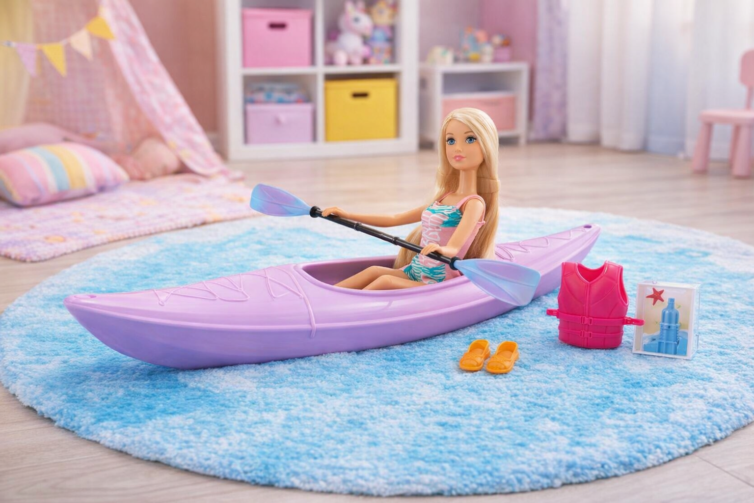 Die Anlily Paddel-Abenteuer Puppe bringt die Freude des Kajakfahrens ins Kinderzimmer! Diese bezaubernde Puppe ist in einem lebhaften Kajak-Set mit pinken und lila Akzenten gestaltet und lädt zu fantasievollen Wasserabenteuern ein. Sie kommt mit Zubehörteilen wie einem Paddel, einer Schwimmweste und stilvollen Sandalen, die für realistischen Spielspaß sorgen. Die detailreiche Verarbeitung und die lebendigen Farben fördern die Kreativität und die motorischen Fähigkeiten von Kindern ab 3 Jahren. Das robuste Design der Puppe sorgt für Sicherheit und langanhaltenden Spielspaß. Perfekt für drinnen und draußen, macht dieses Set jede Spielzeit zu einem spannenden Erlebnis und ist ein ideales Geschenk für kleine Entdeckerinnen.