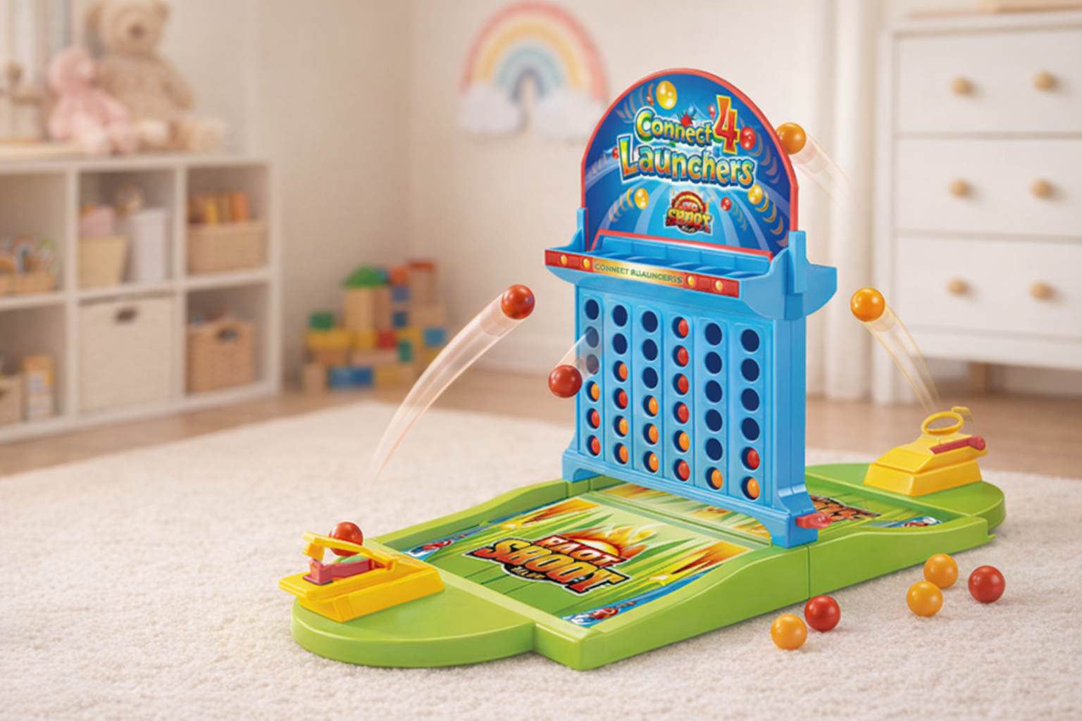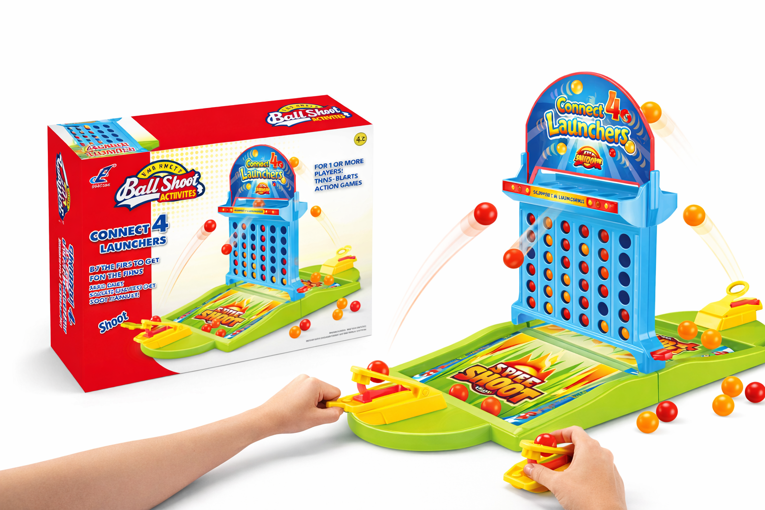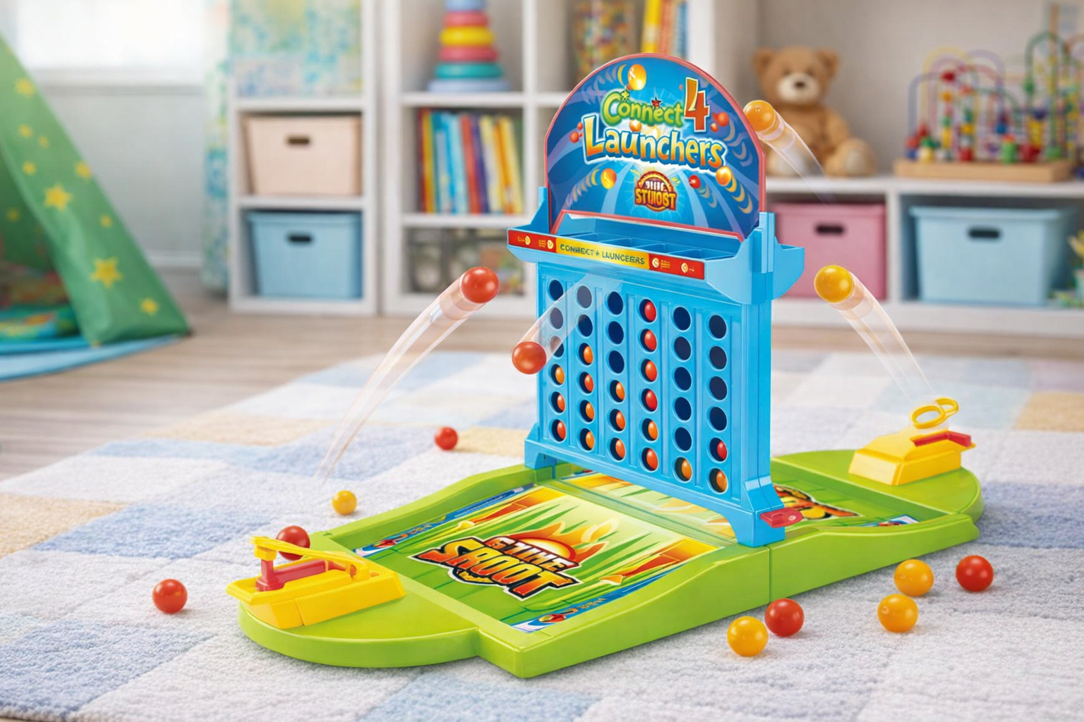 Dieses farbenfrohe Connect 4 Spiel bringt dank seiner einzigartigen Abschussmechanik neuen Schwung ins klassische Strategieerlebnis. Das Spiel besteht aus robustem, glattem Kunststoff und bietet eine sichere und langlebige Spielplattform für Kinder. Mit leuchtenden Farben in Blau, Gelb und Rot zieht es sofort die Aufmerksamkeit auf sich. Kinder können die Bälle mit der Abschussmechanik in die Spielfelder schießen, was sowohl Zielgenauigkeit als auch strategisches Denken fördert. Ideal für Kinder ab 5 Jahren, bietet es Spaß für drinnen und spannende Wettkämpfe mit Freunden oder Familie. Ein tolles Geschenk, das pädagogische Vorteile mit reichlich Spielspaß kombiniert.