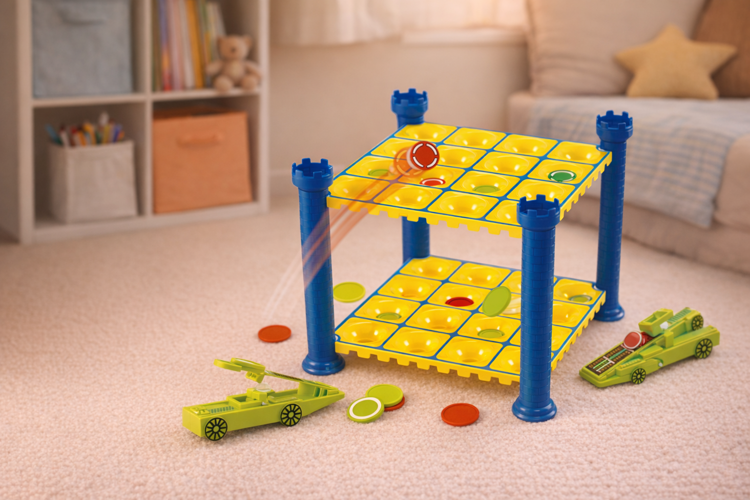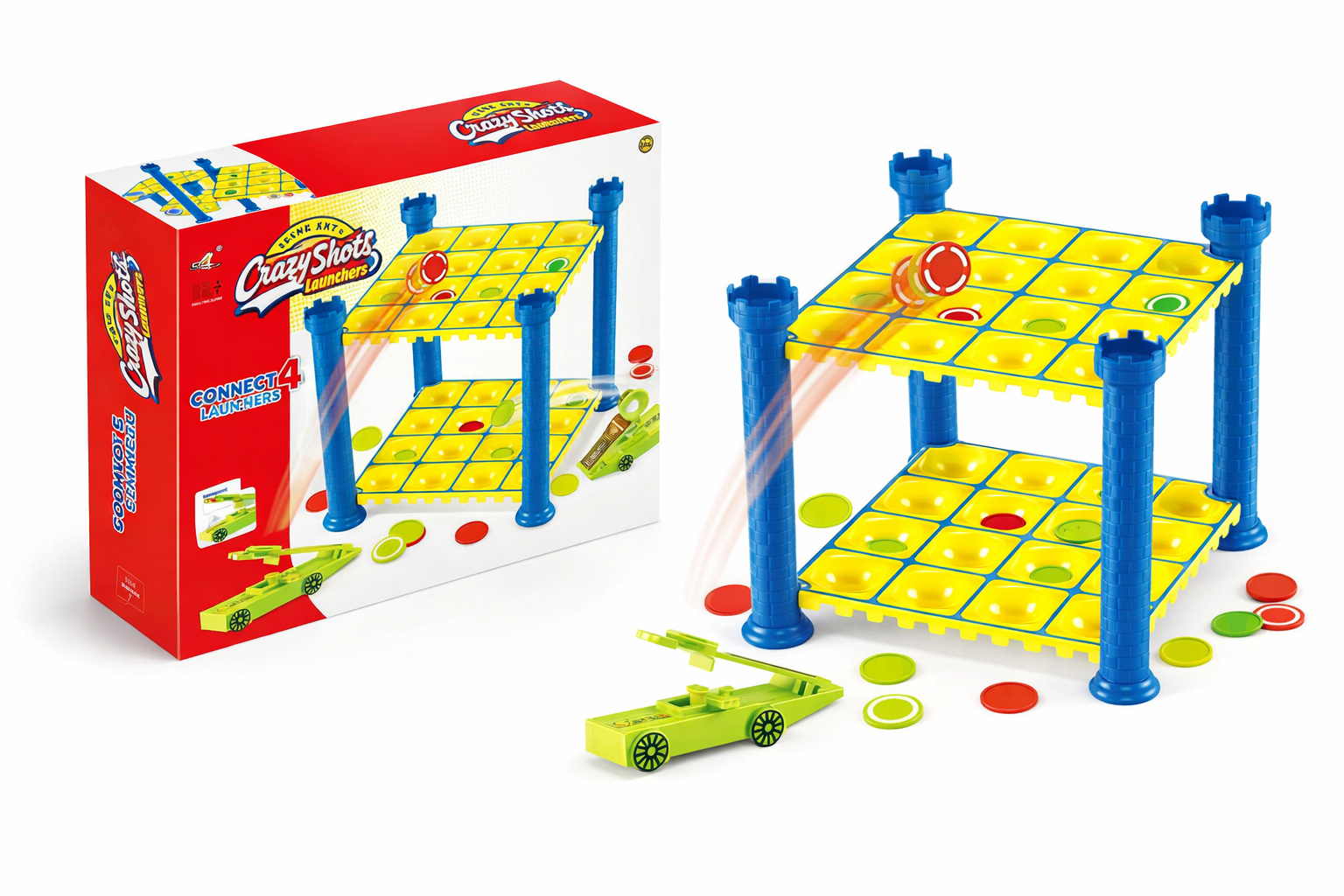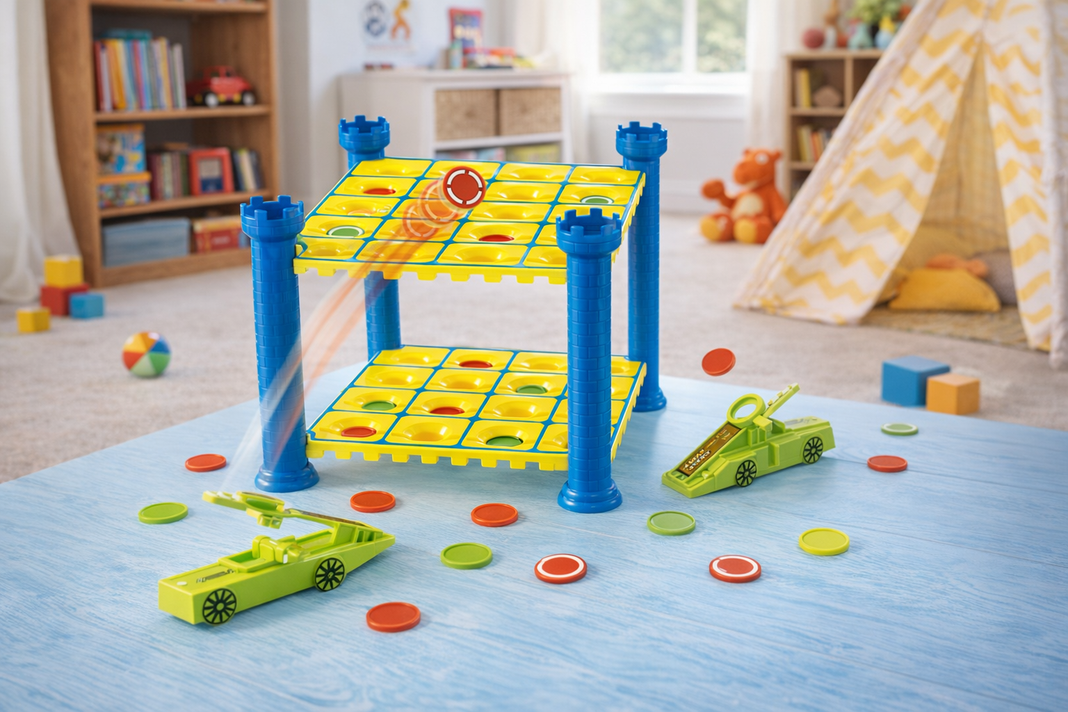 Tauchen Sie ein in ein spannendes Spielerlebnis mit unserem bunten Geschicklichkeitsspiel, das kreative Katapult-Action bietet! Das Spiel besteht aus zwei Ebenen mit leuchtend gelben Feldern, gehalten von stabilen blauen Säulen in Form von Burgtürmen. Mit den enthaltenen grünen Katapulten können Spieler kleine Scheiben zielsicher auf das Spielfeld katapultieren, um ihren Gegner zu überlisten. Geeignet für Kinder ab 6 Jahren, fördert dieses Spiel strategisches Denken, Hand-Augen-Koordination und Feinmotorik. Die robusten Materialien sorgen für langanhaltenden Spielspaß drinnen oder draußen und machen es zu einem idealen Geschenk für neugierige kleine Abenteurer.