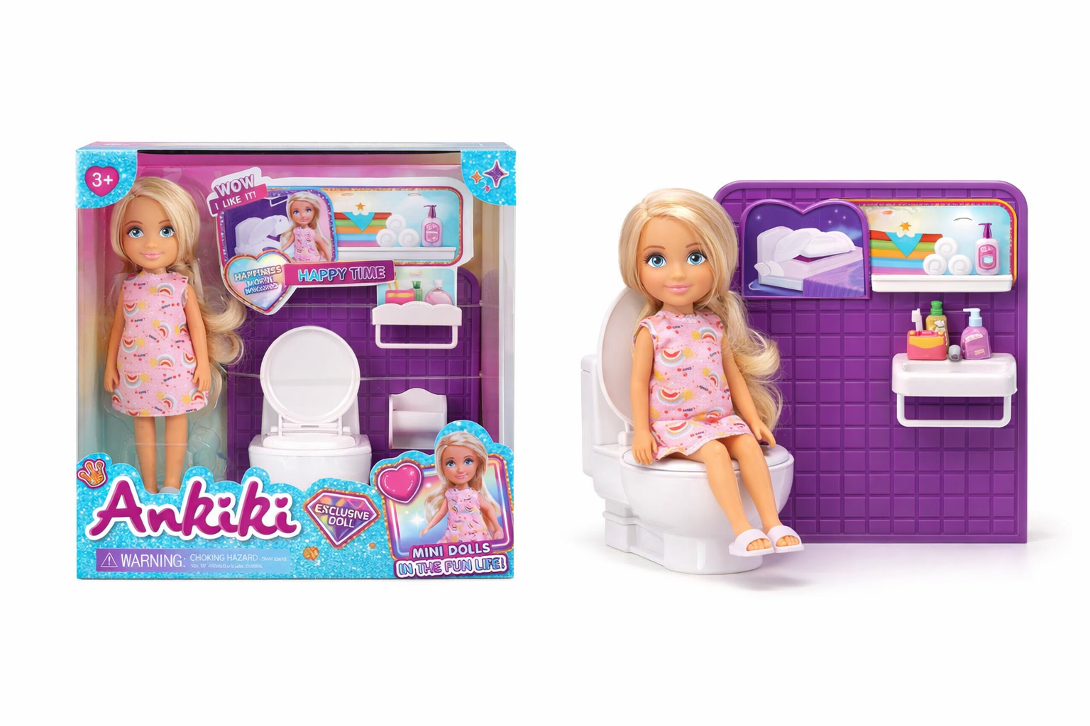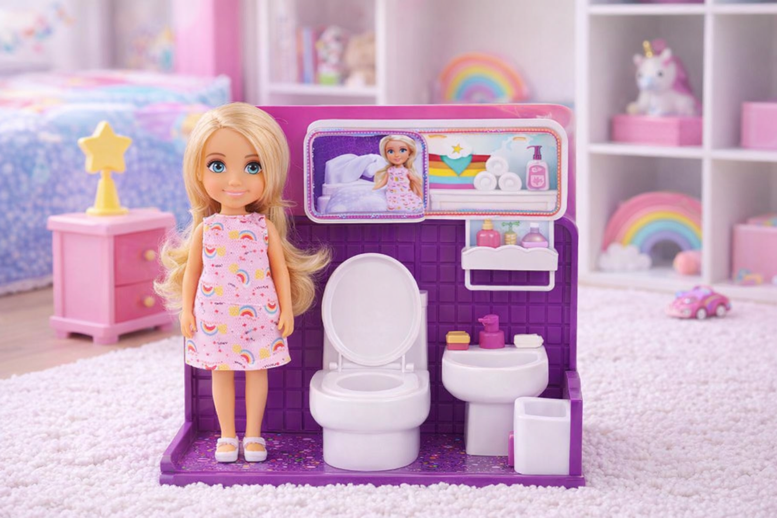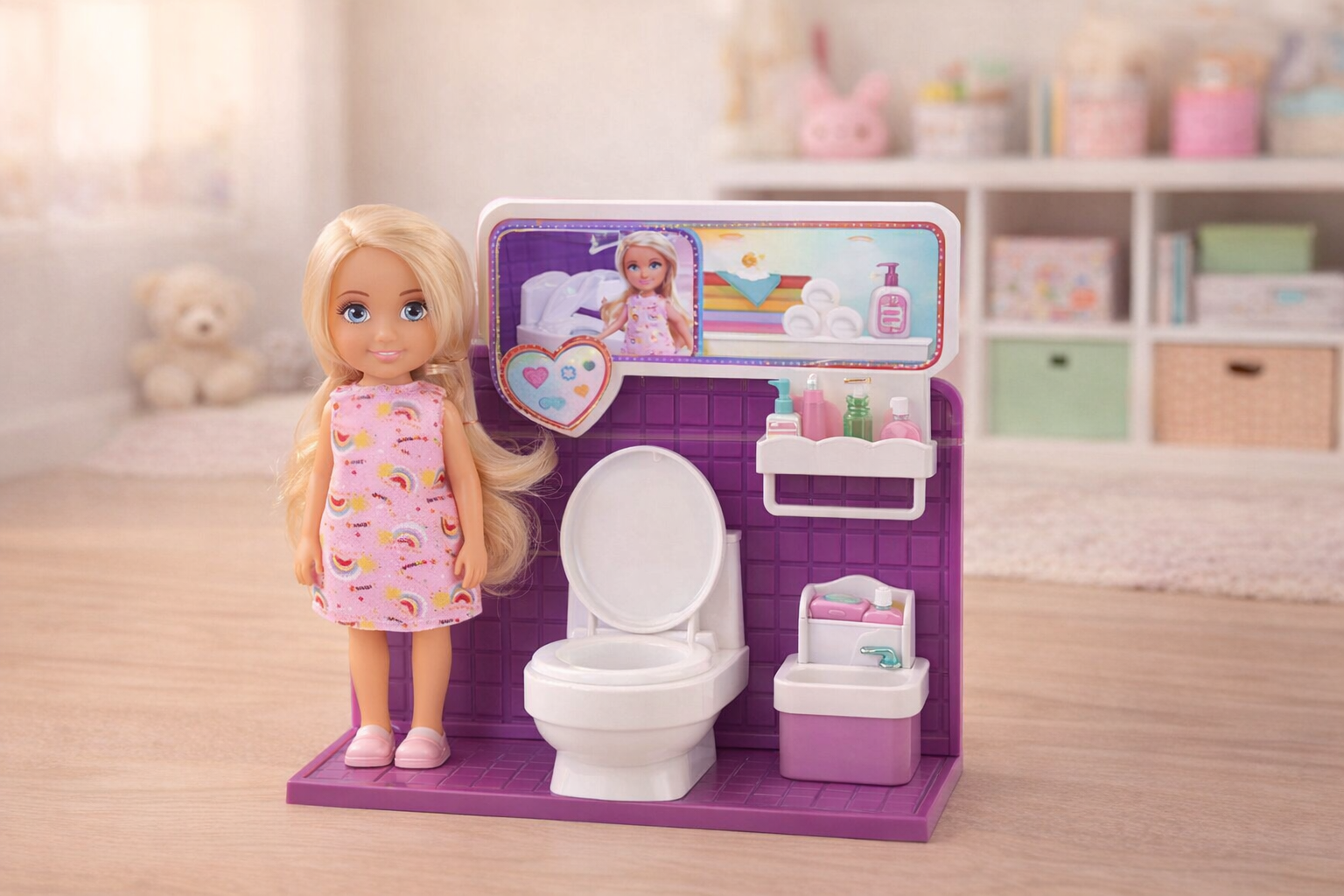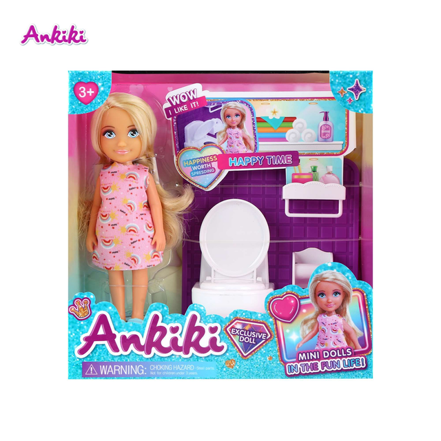 Fröhliche Mini-Puppe mit Badezimmer-Set – 5 Zoll
