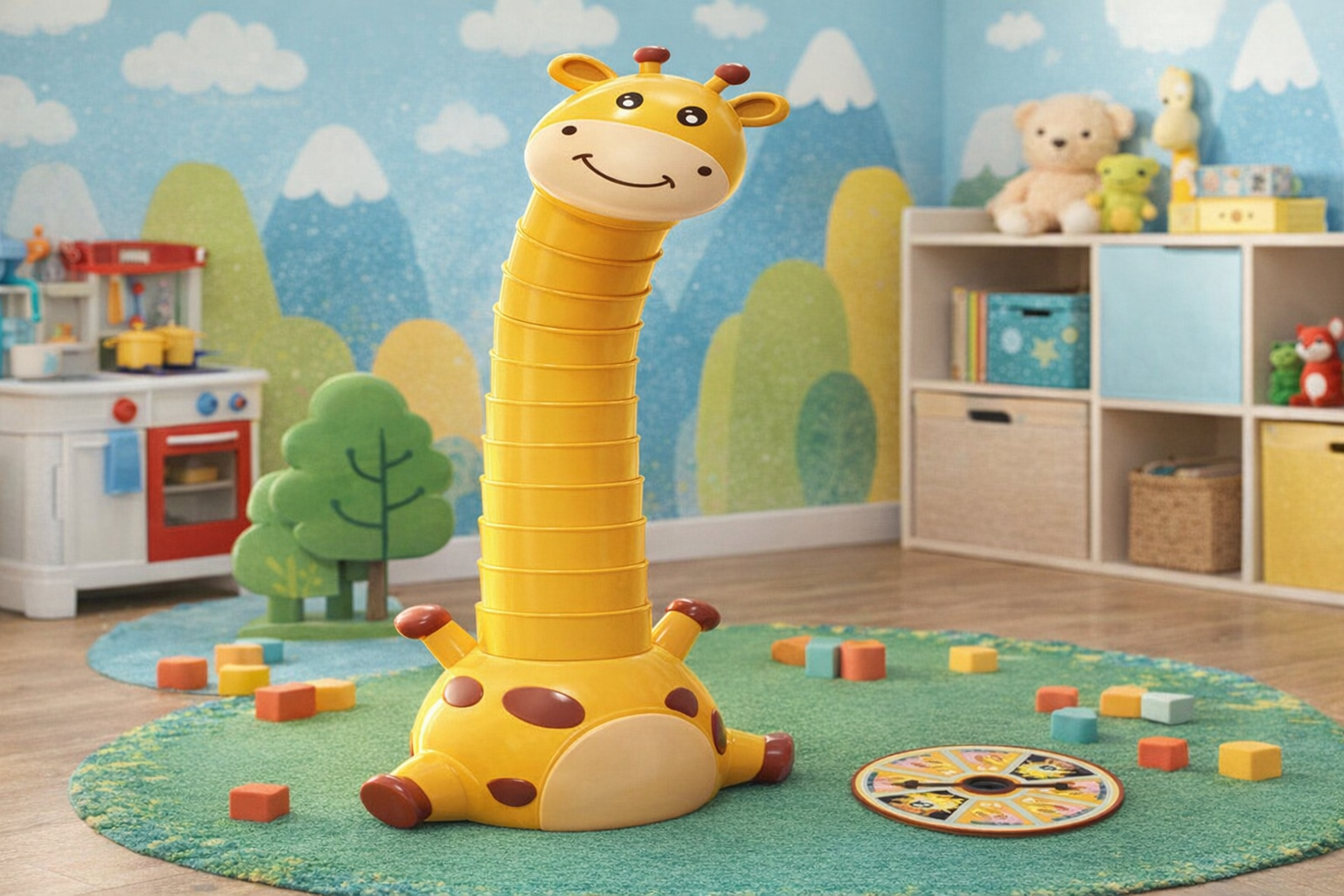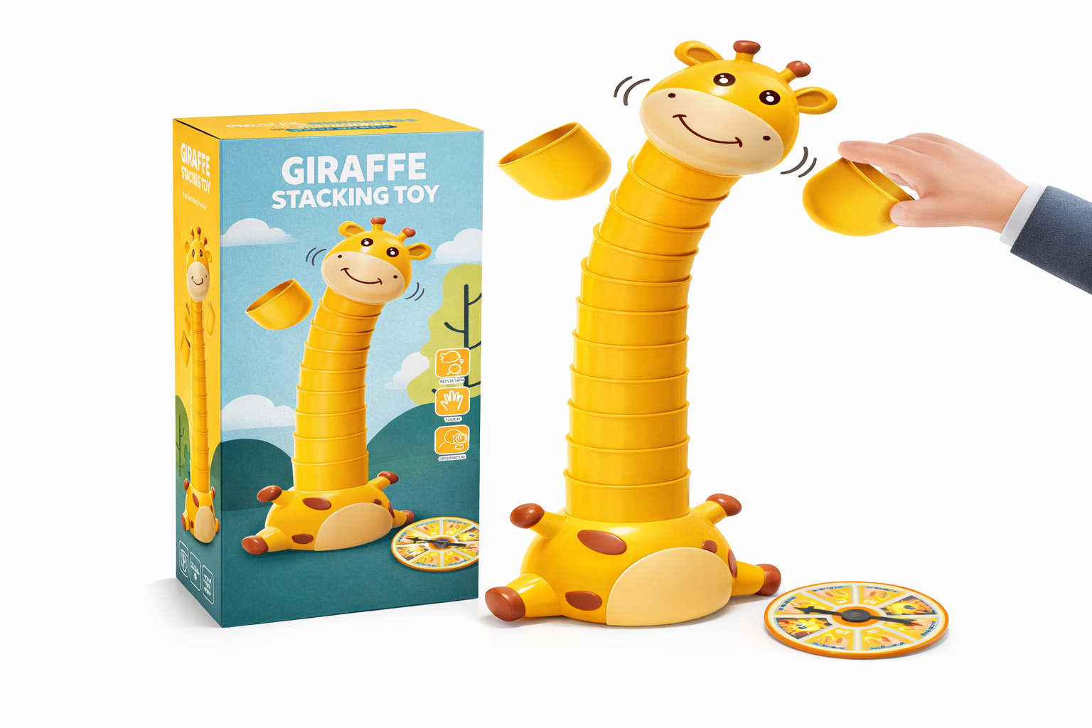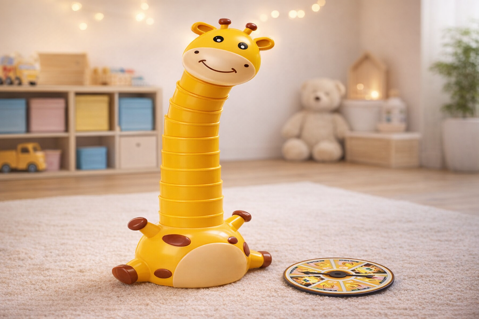 Dieses fröhliche Giraffenstapelspiel begeistert mit seinem leuchtend gelben Design und niedlichem Giraffengesicht. Die stapelbaren Teile sind aus robustem und ungiftigem Kunststoff gefertigt, ideal für kleine Hände. Kinder können die Teile aufeinanderstapeln und ihre motorischen Fähigkeiten sowie Hand-Augen-Koordination verbessern. Das Spiel bietet interaktive Elemente, da die Giraffe beim Stapeln aufrecht bleibt und bei falscher Bewegung umfallen kann, was die Geschicklichkeit fördert. Perfekt für Kinder ab 3 Jahren, sowohl für drinnen als auch unterwegs, ist dieses Spielzeug ein wunderbares Geschenk, das Spaß und Lernen verbindet.