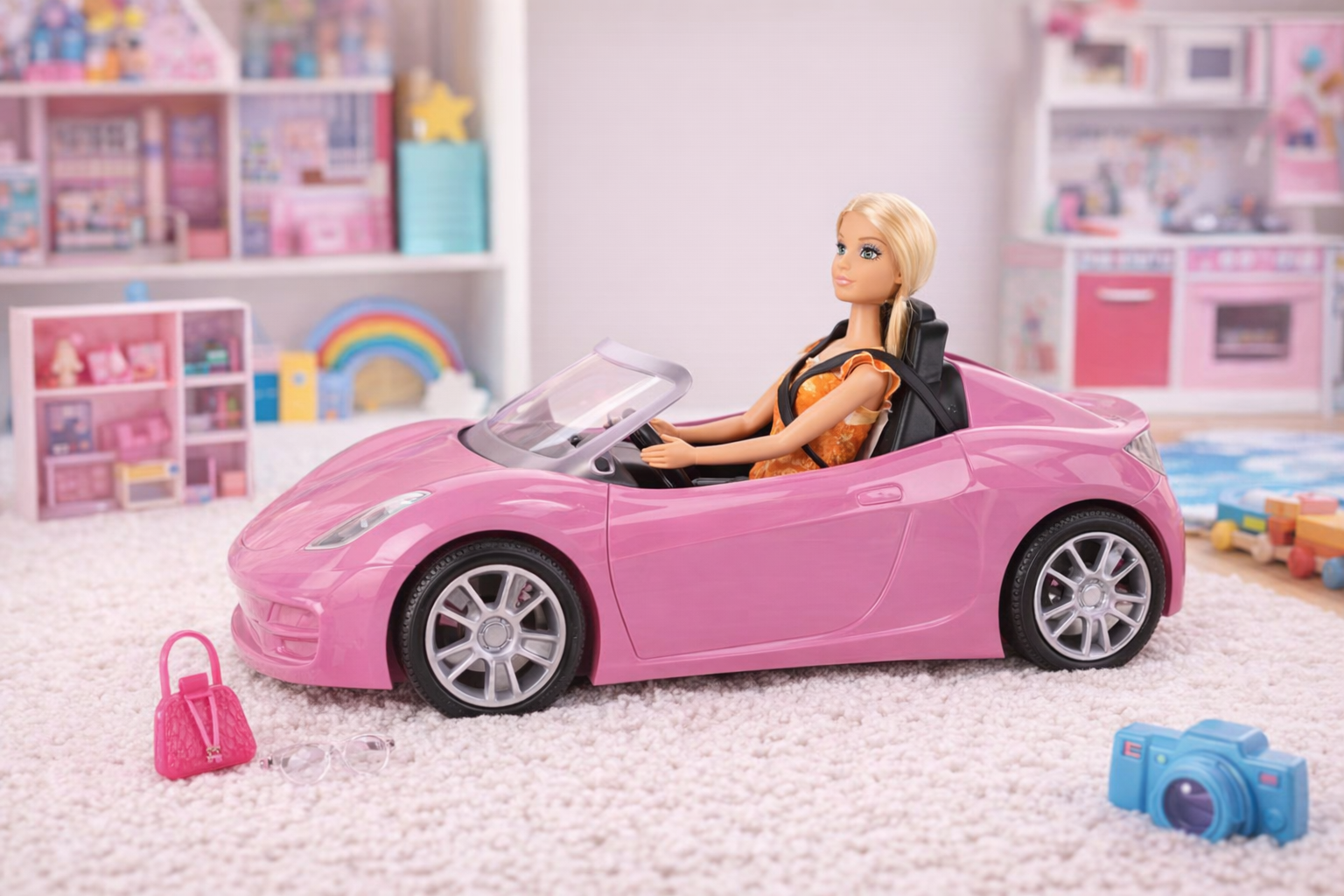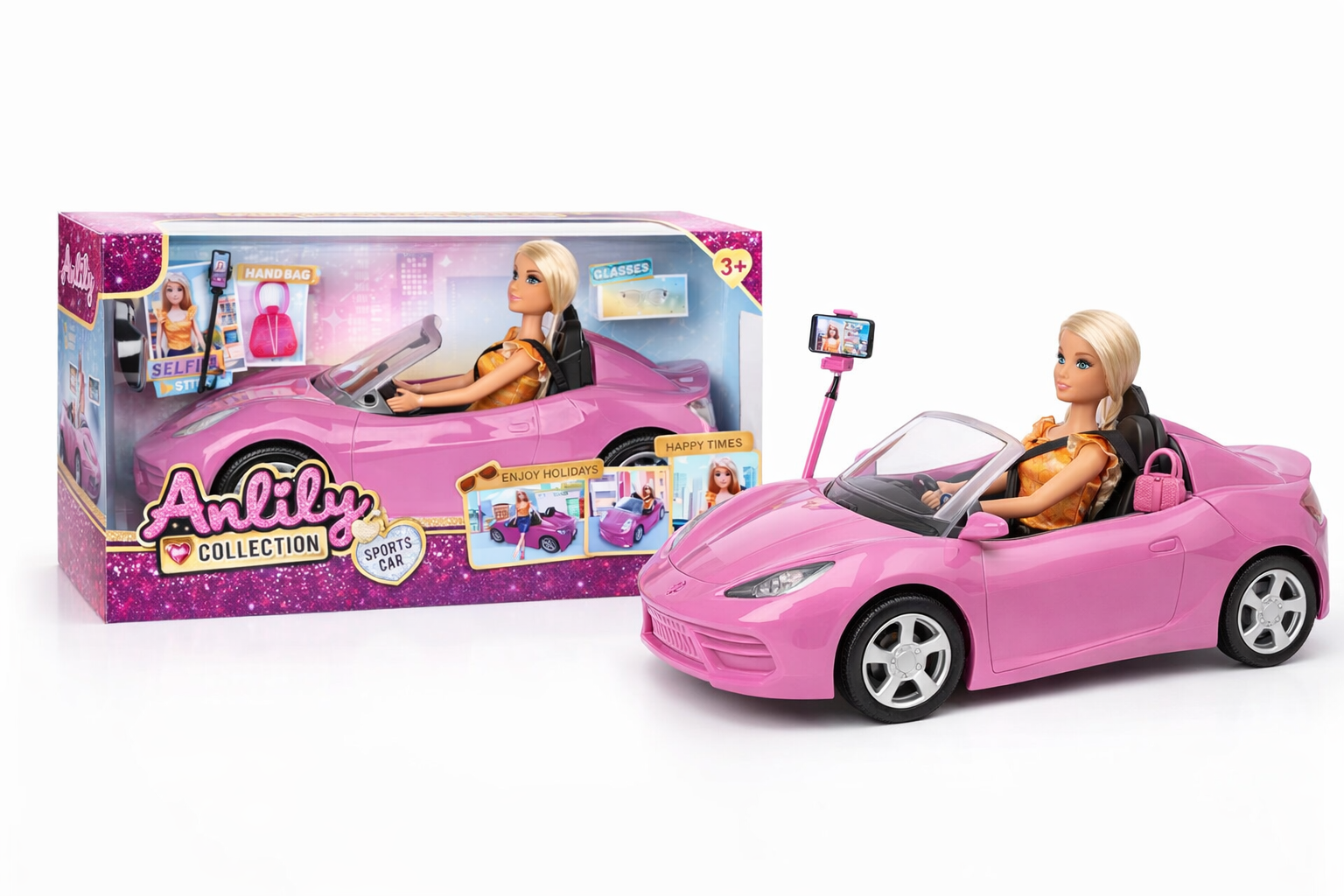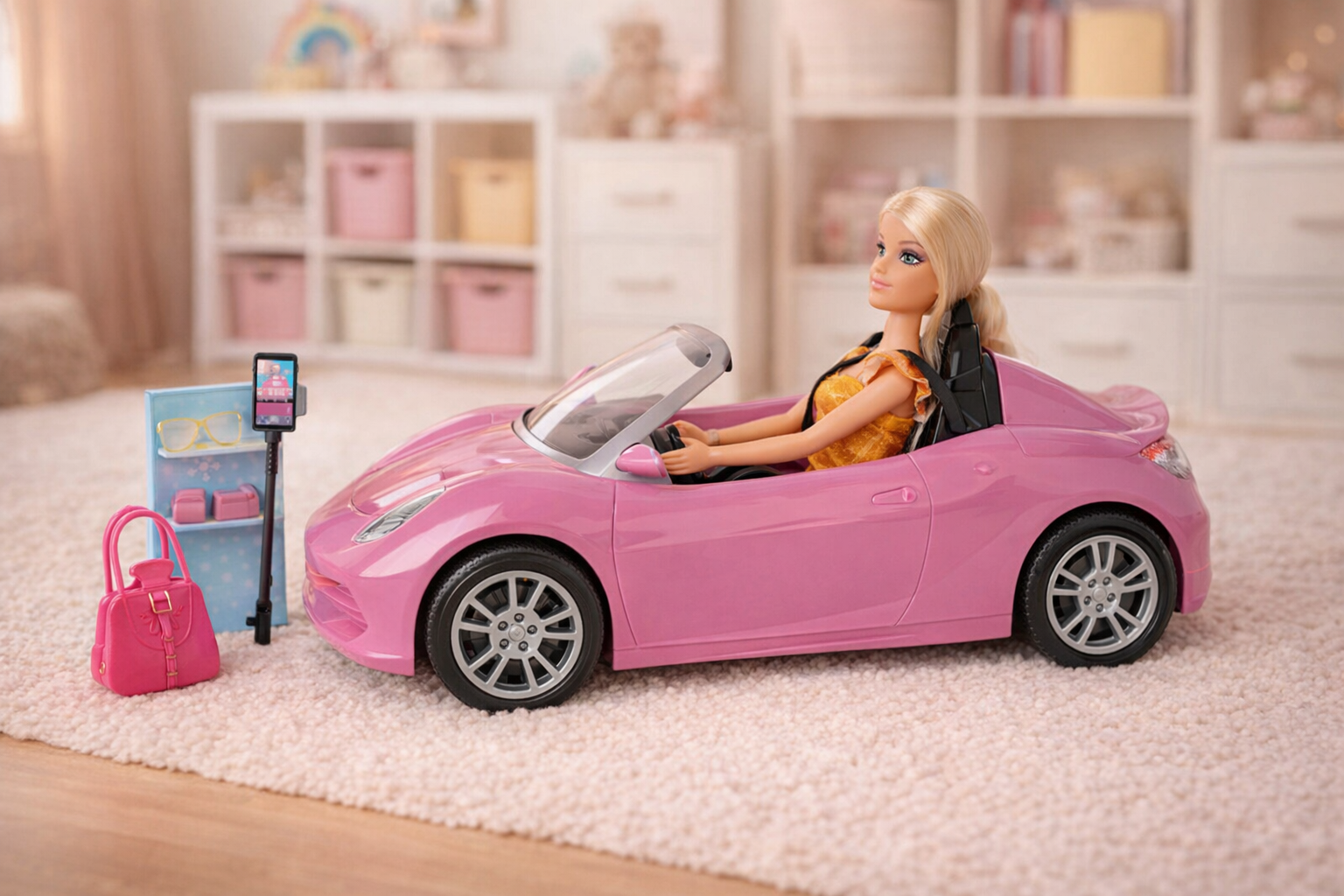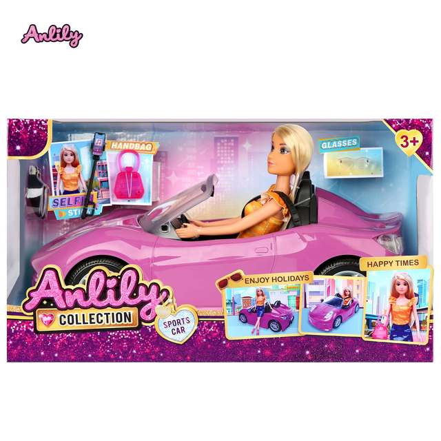 Glamouröse Modepuppe mit Sportwagen und Accessoires