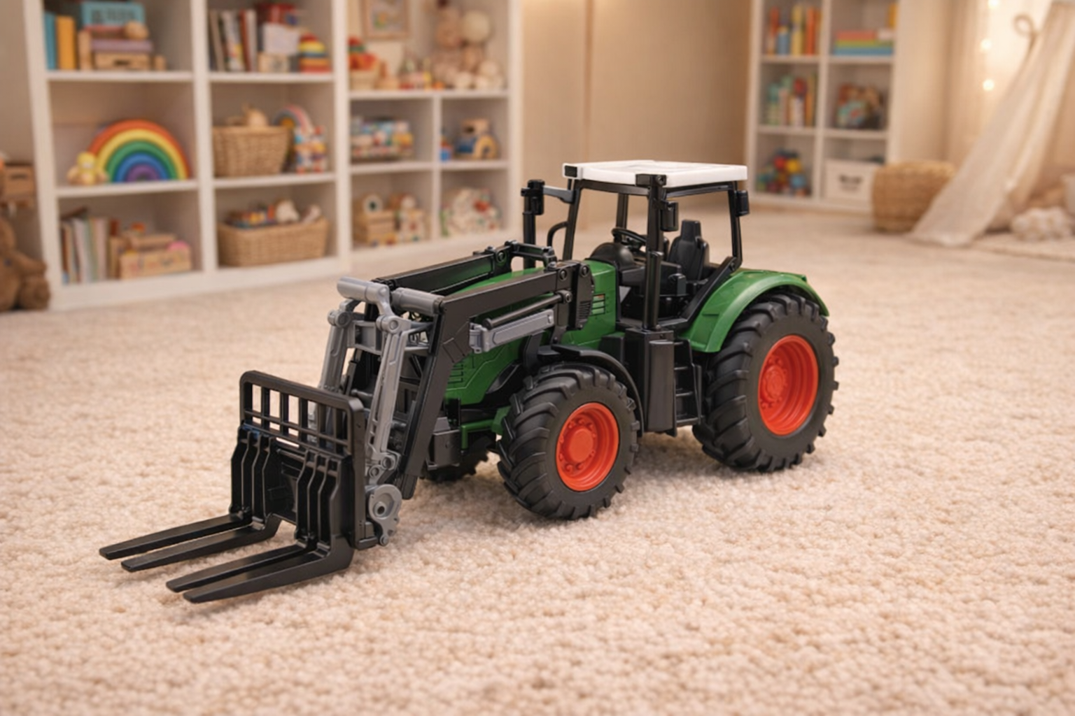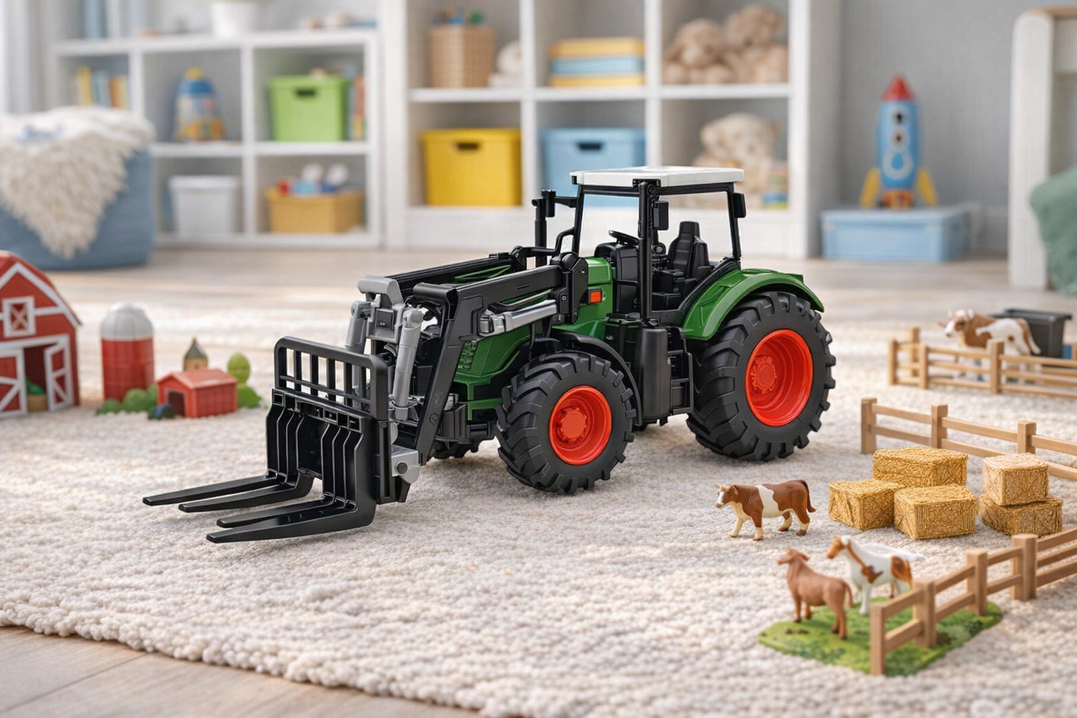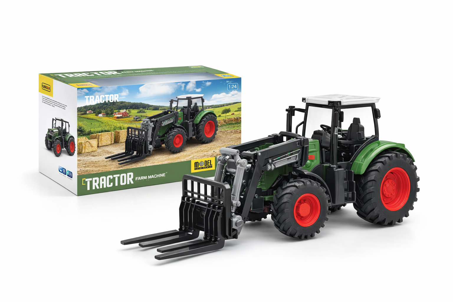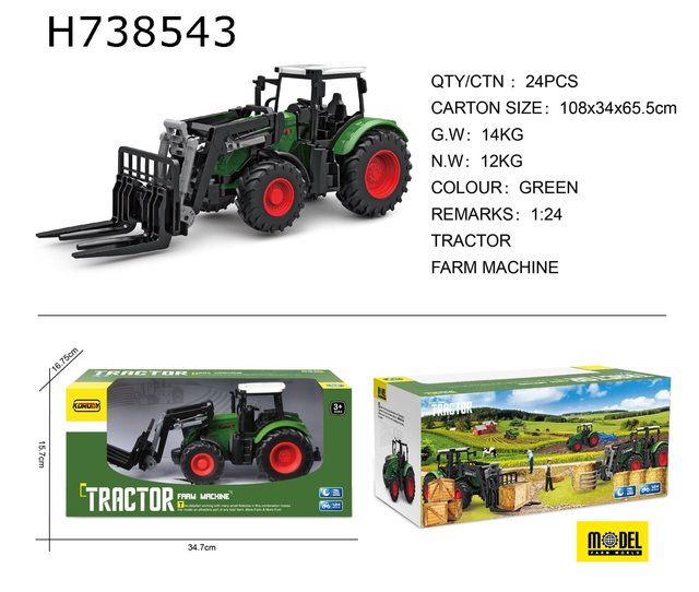Dieser robuste grüne Spielzeugtraktor im Maßstab 1:24 bringt die aufregende Welt der Landwirtschaft ins Kinderzimmer. Mit seiner detailgetreuen Nachbildung überzeugt er durch ein realistisches Design in sattem Grün mit kontrastierenden roten Rädern. Die bewegliche Schaufel vorne ermöglicht interaktives Spiel, ideal für kleine Hände, um das Heben und Bewegen von Spielzeuglasten zu üben. Hergestellt aus hochwertigem Kunststoff, ist der Traktor sowohl langlebig als auch sicher für Kinder ab 3 Jahren. Perfekt für drinnen und draußen bietet er stundenlangen Spielspaß und fördert die Entwicklung motorischer Fähigkeiten und die Kreativität beim Nachspielen von Bauernhofszenarien. Ein tolles Geschenk für kleine Entdecker und zukünftige Landwirte.