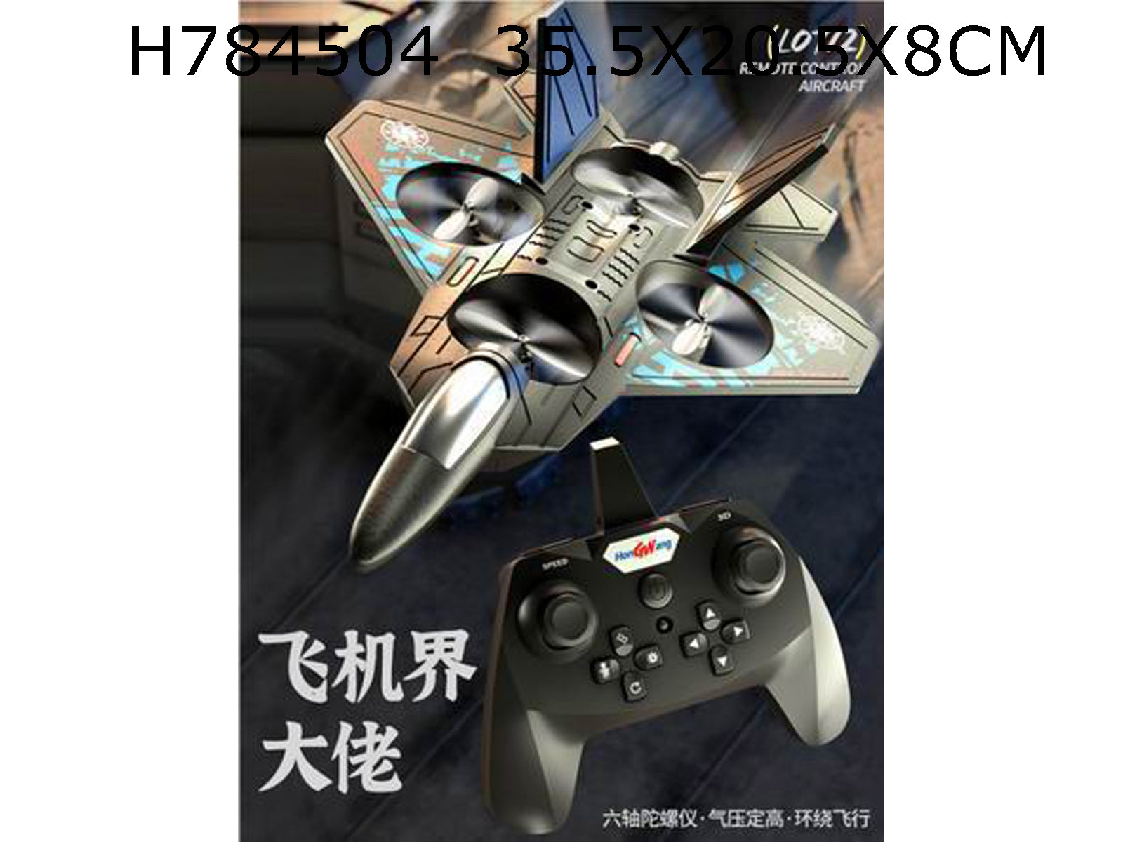 Im Set ist eine Gaming-inspirierte Fernsteuerung mit zwei Joysticks, mehreren Funktionstasten sowie einem zentralen Schalter enthalten. Aufdrucke wie „HonXinWing“ und „3D“ sind auf der Steuerung sichtbar. Das abgebildete Maß des Flugzeugs beträgt ca. 35,5 × 20 × 8 cm.