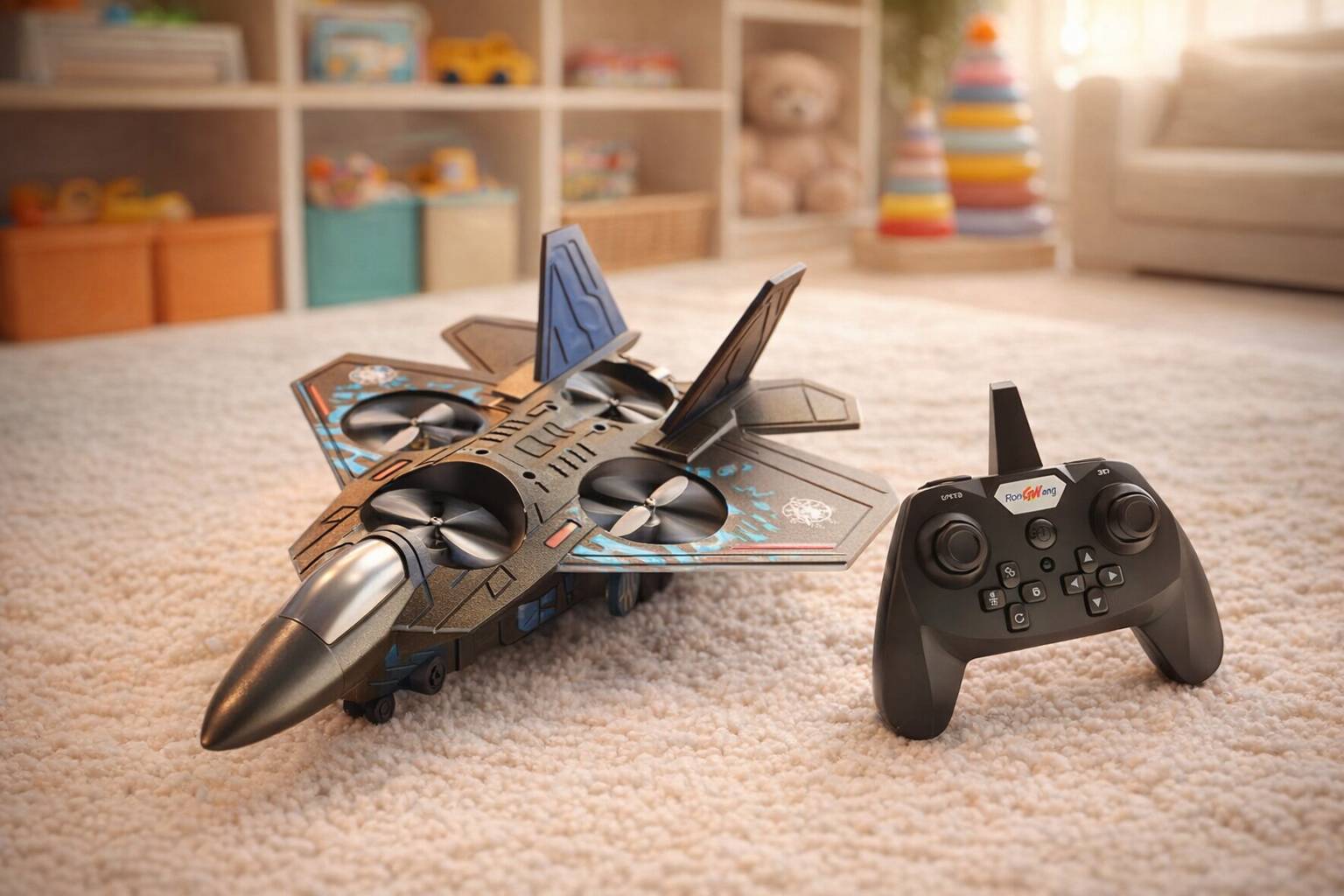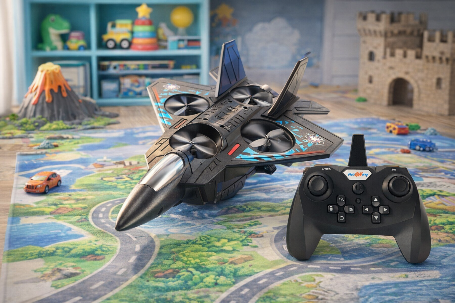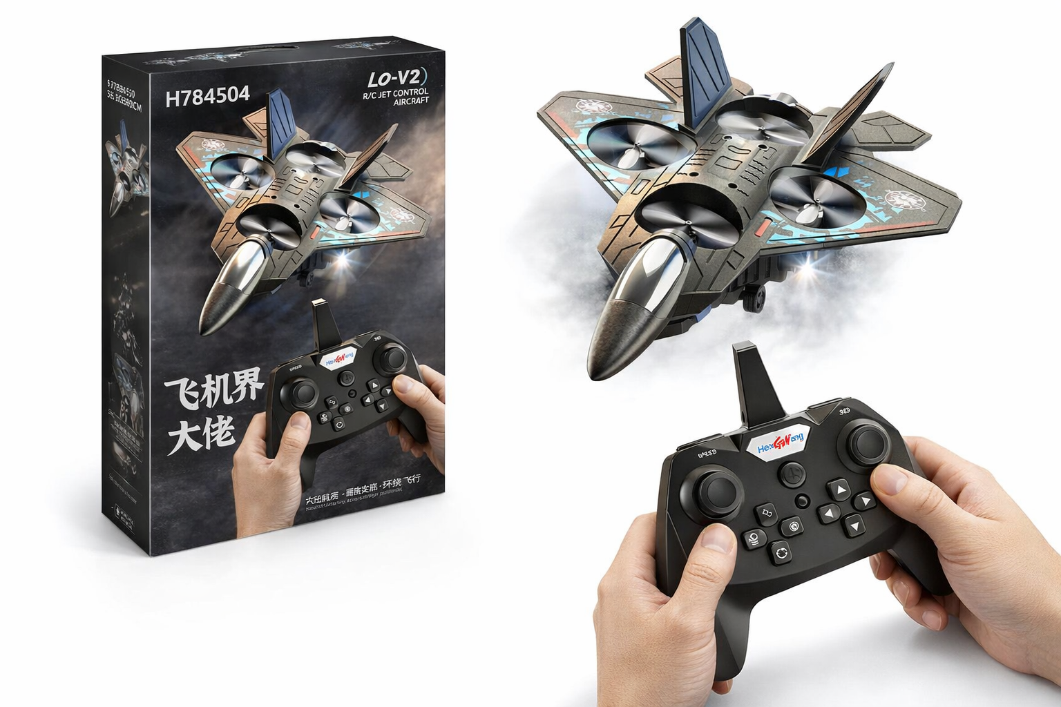 Erlebe rasante Flugaction mit diesem ferngesteuerten RC-Flugzeug im futuristischen Jetfighter-Design. Das Modell ist in einer dunklen Farbgebung gehalten und mit markanten blauen Akzenten, Insignien und feinen Oberflächen-Details versehen – für einen besonders realistischen Look. Das Highlight: Drei integrierte Ducted-Fan-Rotoren (zwei in den Tragflächen, einer im Rumpf) sorgen für einen kraftvollen Antrieb und lassen auf VTOL-Fähigkeiten (senkrechter Start & Landung) schließen. Die silberfarbene Nase und die kantigen Flügel- und Leitwerksformen unterstreichen den modernen Charakter des Jets.