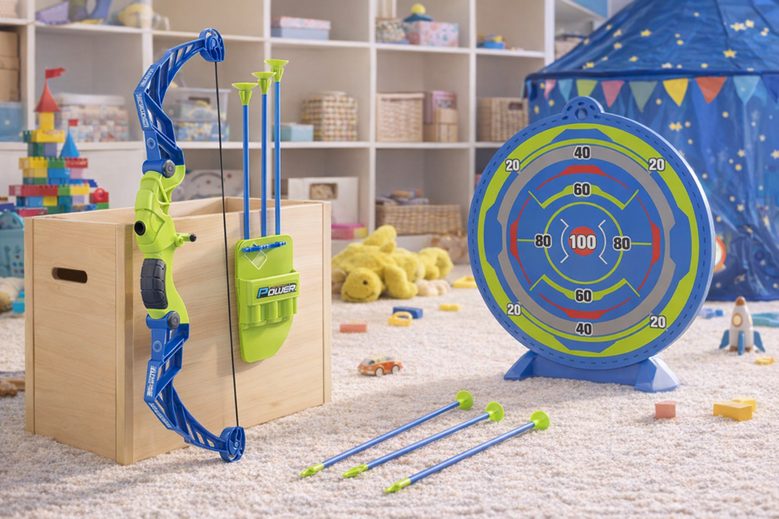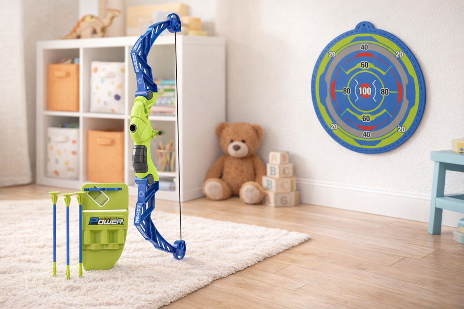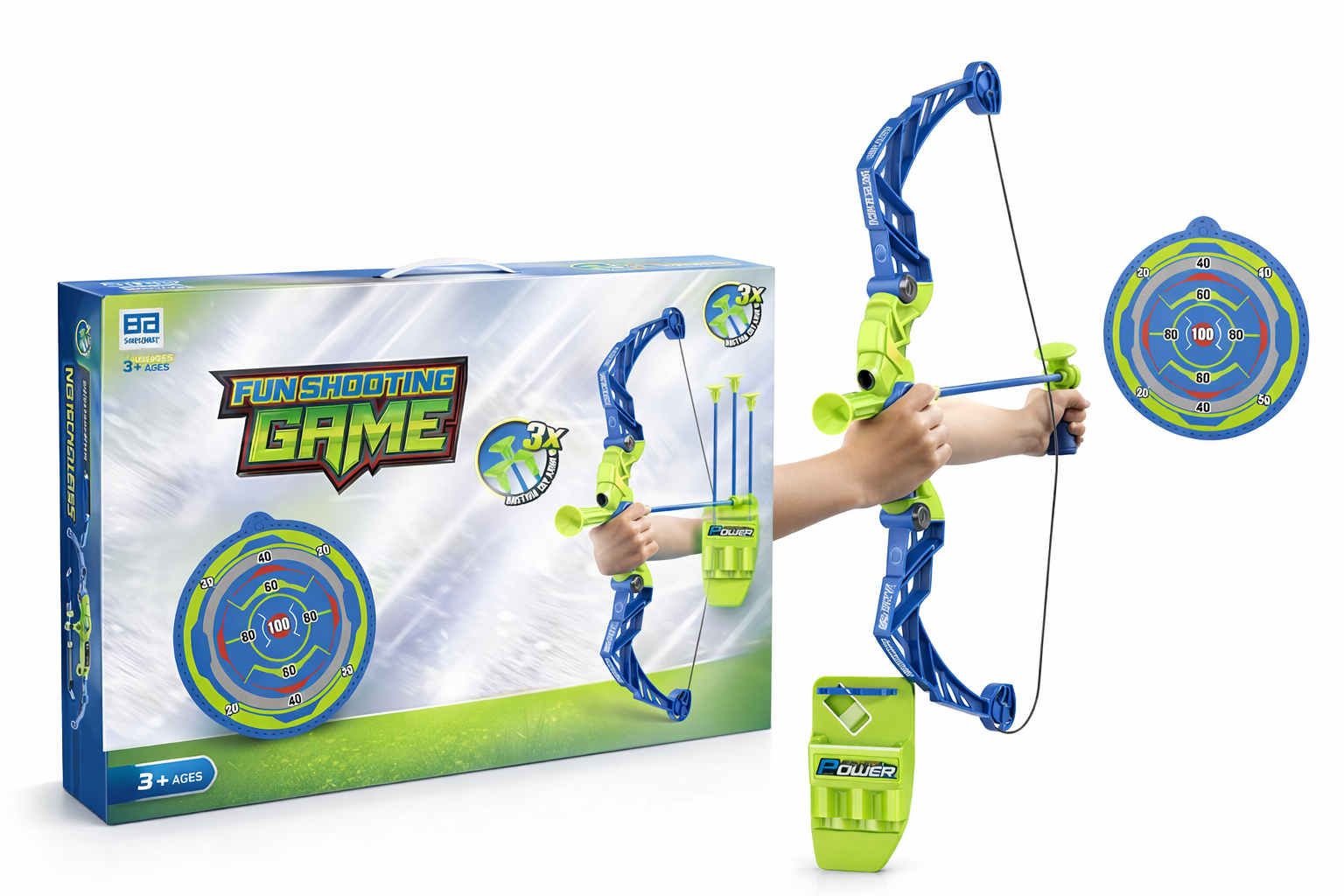 Erleben Sie spannende Abenteuer mit diesem leuchtend blauen und grünen Bogen- und Pfeilset. Der Bogen aus strapazierfähigem Kunststoff ist 57 cm lang und liegt dank ergonomischen Griffen sicher in kleinen Händen. Die Pfeile mit Saugnapfspitzen sorgen für sicheres Spielen und lassen sich leicht an glatten Oberflächen befestigen. Eine Zielscheibe fördert die Zielgenauigkeit und verbessert die Hand-Augen-Koordination. Perfekt für Kinder ab 3 Jahren, bietet dieses Set stundenlangen Spielspaß drinnen und draußen. Ein robustes und sicheres Geschenk für kleine Abenteurer.
