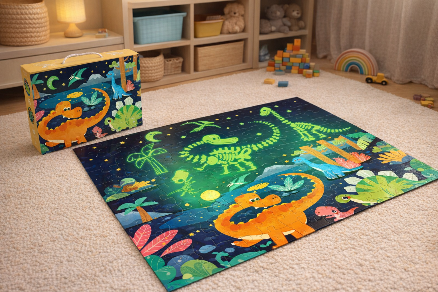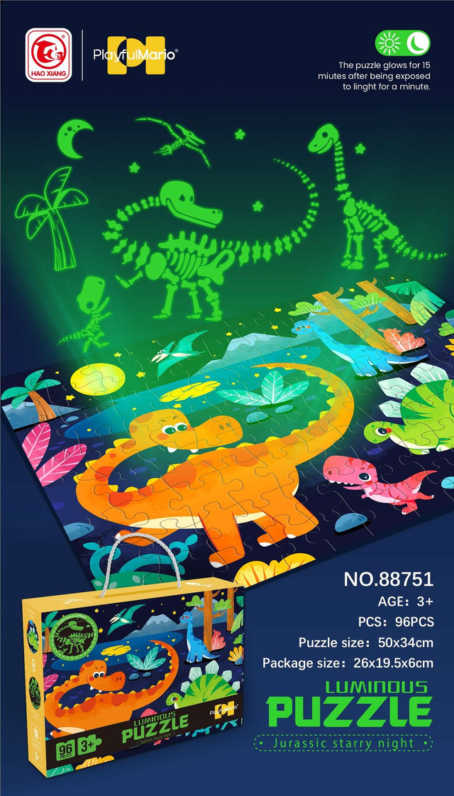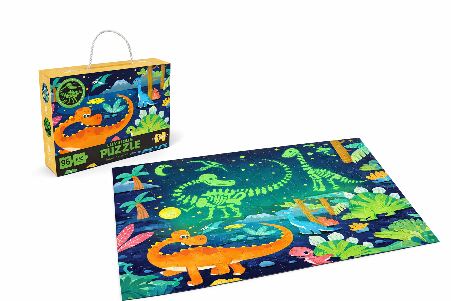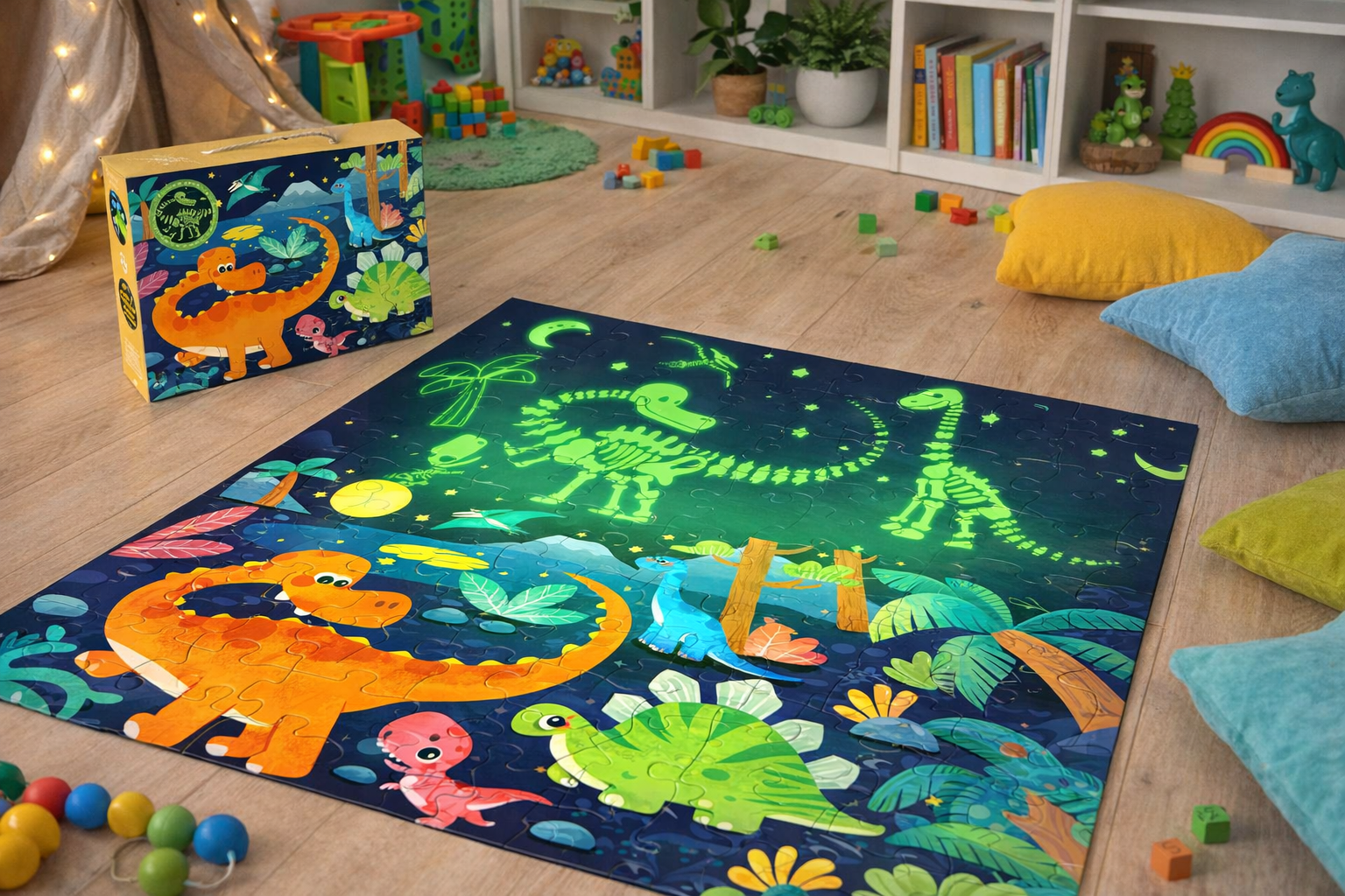 Erleben Sie die Faszination der Dinosaurier mit diesem leuchtenden Puzzle! Mit 96 Teilen zeigt das farbenfrohe Design eine lebendige prähistorische Landschaft, die bei Lichteinfall im Dunkeln erstrahlt. Hergestellt aus robustem Material, garantiert es langlebigen Spielspaß. Perfekt für Kinder ab 3 Jahren, fördert dieses Puzzle die Feinmotorik und die Problemlösungsfähigkeiten. Die leuchtenden Elemente sorgen für zusätzlichen Spaß und machen es zu einem besonderen Erlebnis in dunklen Räumen. Ideal für drinnen und eine großartige Geschenkidee für neugierige kleine Entdecker.