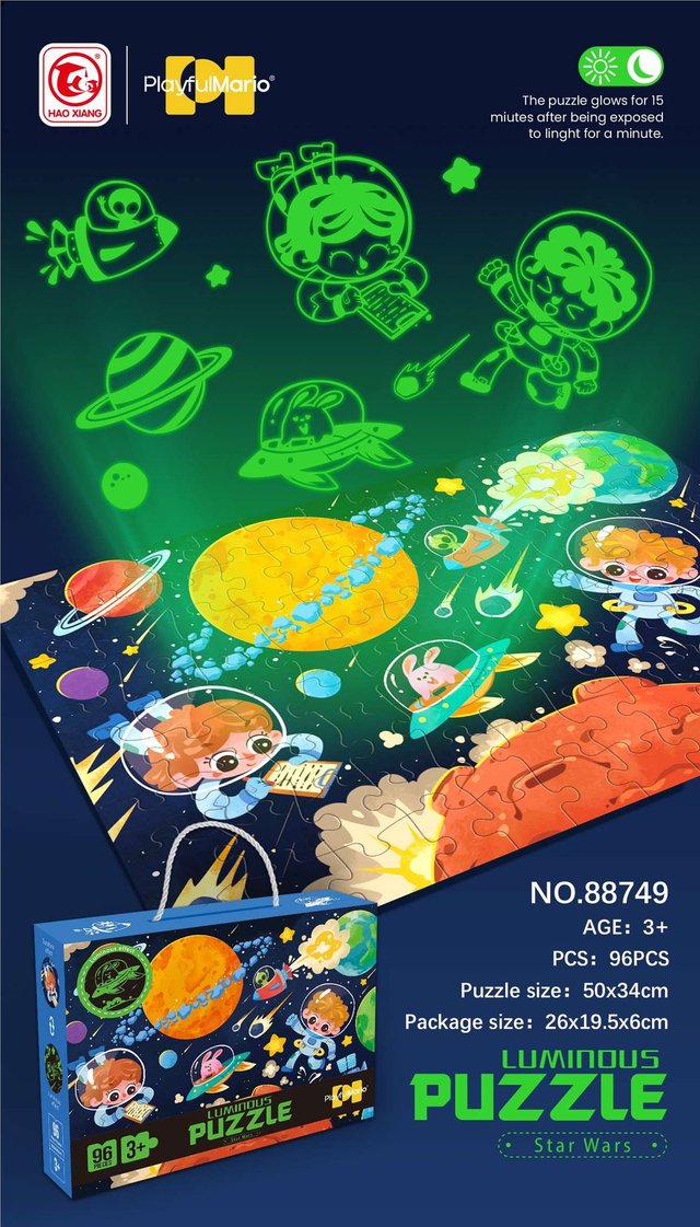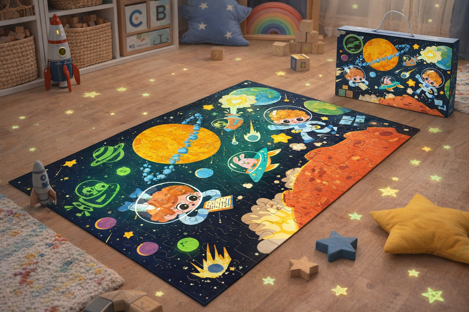 Entdecken Sie das Universum mit diesem farbenfrohen leuchtenden Puzzle, das speziell für kleine Entdecker ab 3 Jahren entwickelt wurde. Mit 96 Teilen zeigt es eine lebendige Weltraumszene mit niedlichen Charakteren und Planeten. Aus hochwertigem, kinderfreundlichem Material gefertigt, sind die Teile robust und perfekt für kleine Hände geeignet. Besonders spannend: Das Puzzle leuchtet im Dunkeln und sorgt für zusätzliche Spielfreude. Fördert die Feinmotorik, Konzentration und Kreativität Ihres Kindes. Ideal für drinnen und ein wunderbares Geschenk für neugierige kleine Astronauten.