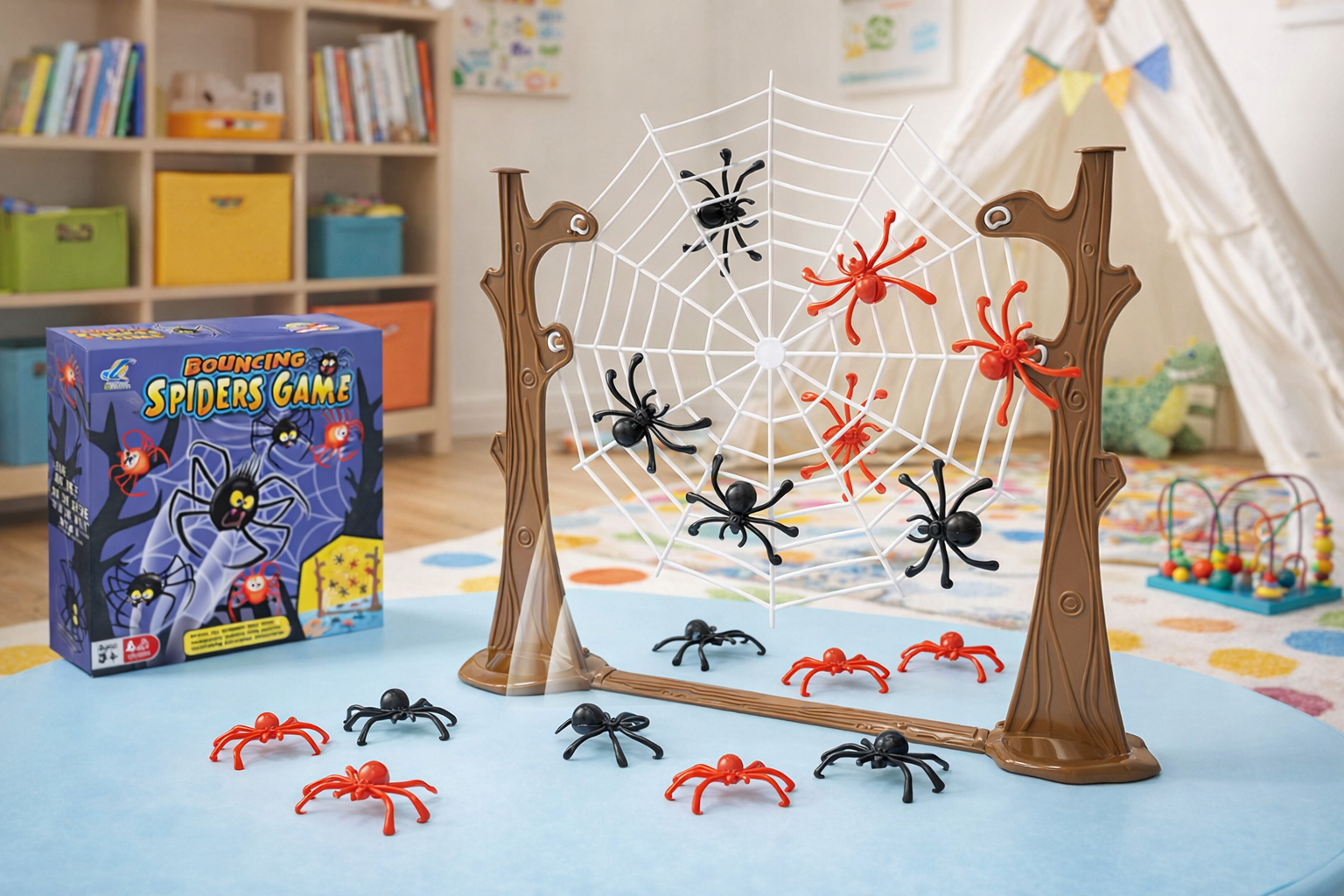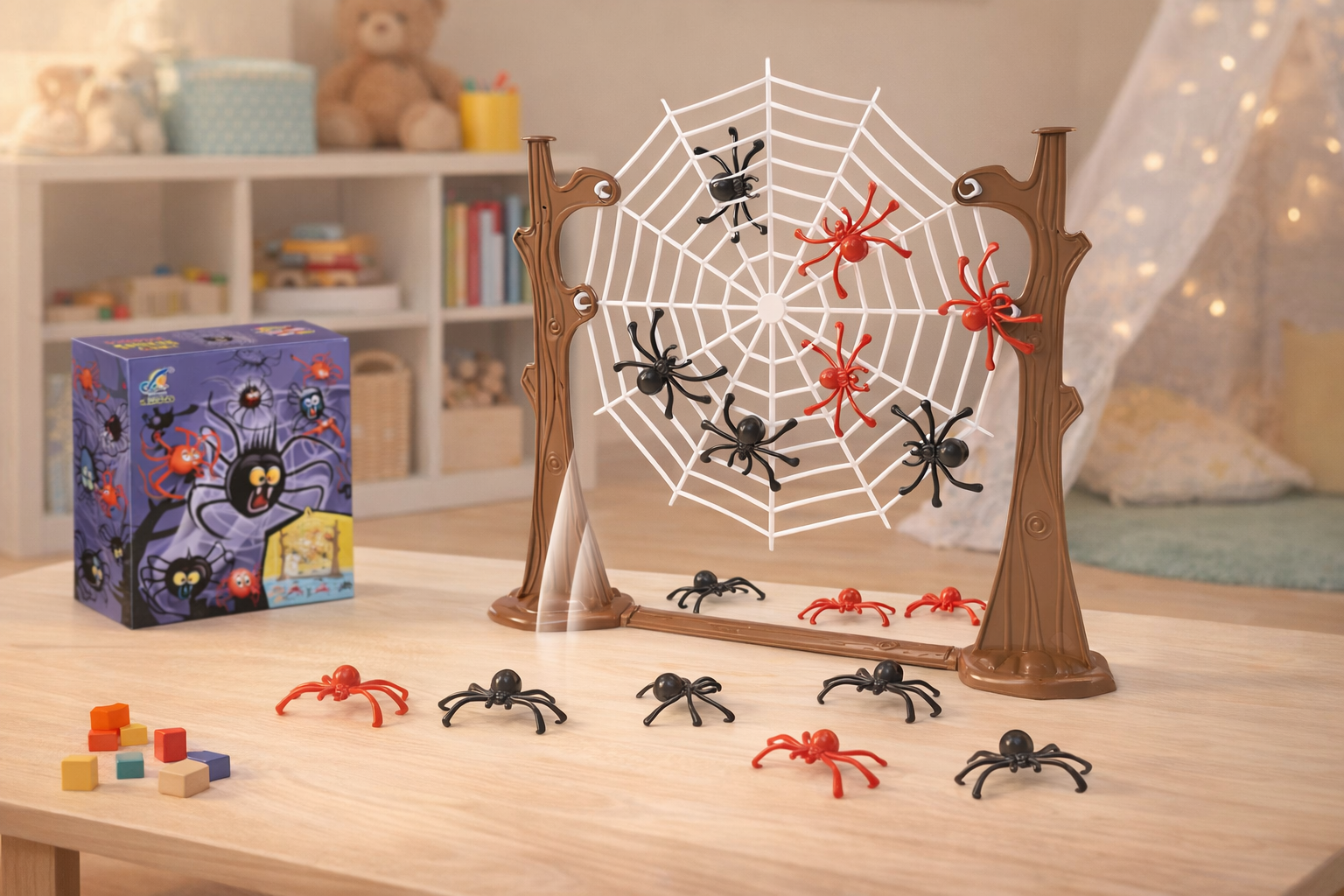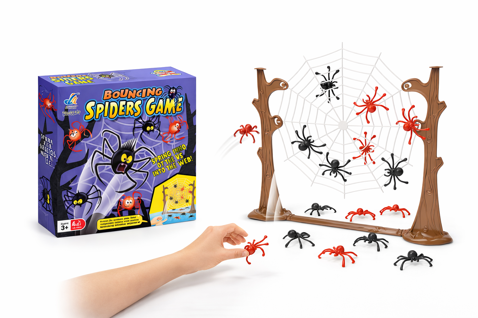 Erleben Sie spannende Spielstunden mit dem Springende Spinnen Spiel! Dieses fantasievolle Geschicklichkeitsspiel besteht aus einem großen, stabilen Spinnennetz, das von zwei robusten Bäumen gehalten wird. Kinder können die farbenfrohen Spinnen aus flexiblem Kunststoff auf das Netz schnippen und versuchen, sie geschicklich zu platzieren. Das Spiel fördert Feinmotorik, Hand-Augen-Koordination und strategisches Denken, während die Kleinen Spaß daran haben, ihre Spinnen auf das Netz zu katapultieren. Ideal für Kinder ab 3 Jahren und perfekt für drinnen oder unterwegs. Die glatten Kanten und das ungiftige Material sorgen dabei für sicheres Spielen. Ein ideales Geschenk für kleine Abenteurer und ein Hit bei jedem Spieleabend!