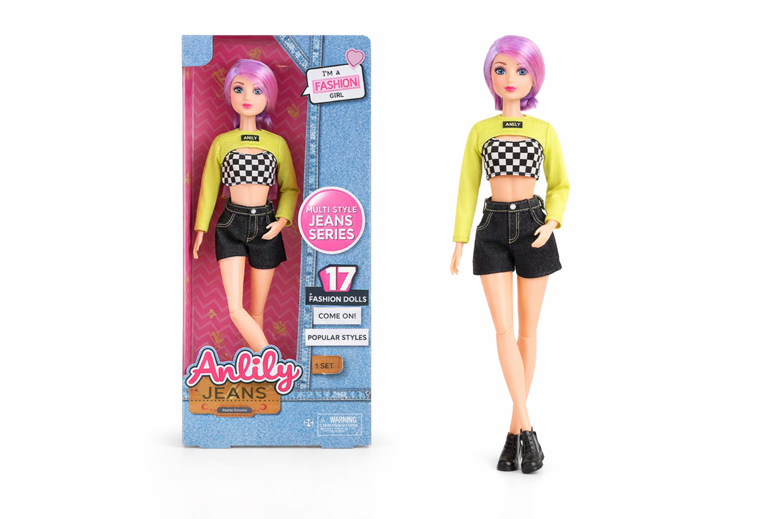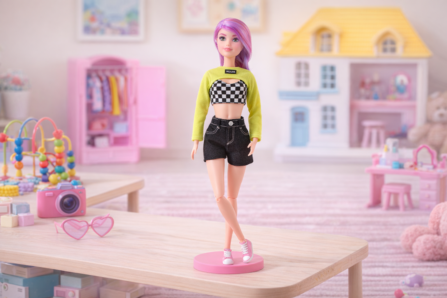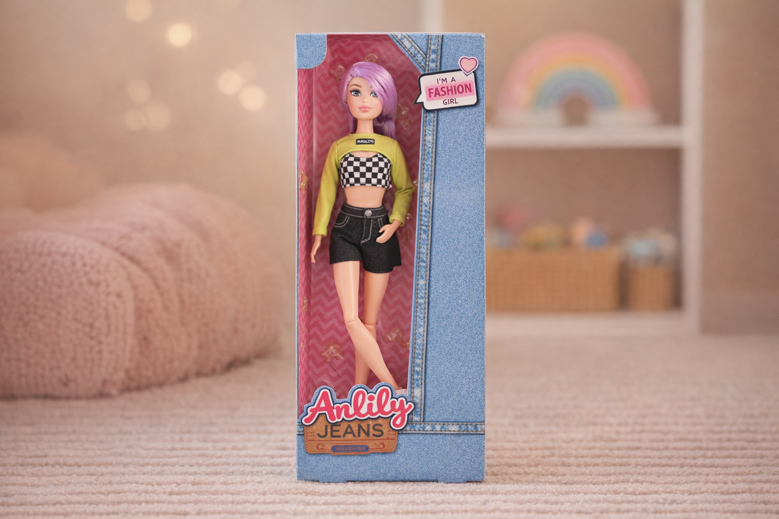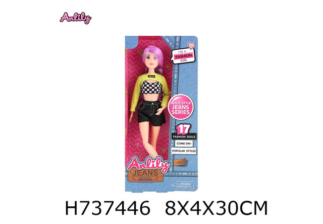 Stilvolle Modepuppe mit Lila Haaren und Trendiger Kleidung