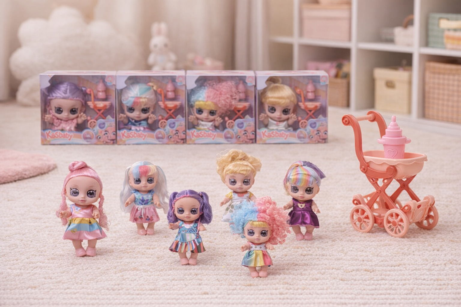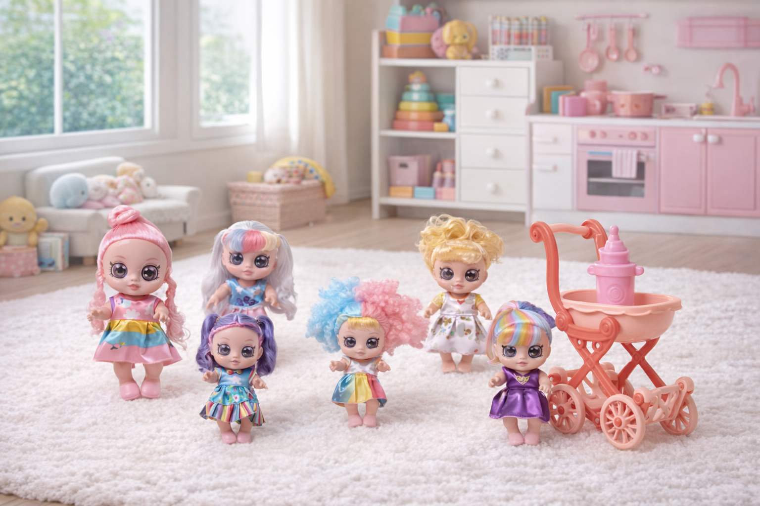 Entdecken Sie die zauberhafte Kandi Sweetheart Puppe mit faszinierenden 5D Augen. Diese hochwertige Vinylpuppe ist 25 cm groß und wird mit einem niedlichen Schiebewagen und sechs bunten Fläschchen geliefert. Ihr detailreiches Design mit lebhaften Farben und verspielten Kleidchen macht sie zum perfekten Begleiter für fantasievolles Spiel. Kinder können ihre Kreativität entfalten, während sie mit der Puppe interagieren und Rollenspiele entwickeln. Die robuste Verarbeitung sorgt für Sicherheit und Langlebigkeit, ideal für Kinder ab 3 Jahren. Ein wunderbares Geschenk für jeden Anlass, das stundenlangen Spaß garantiert.