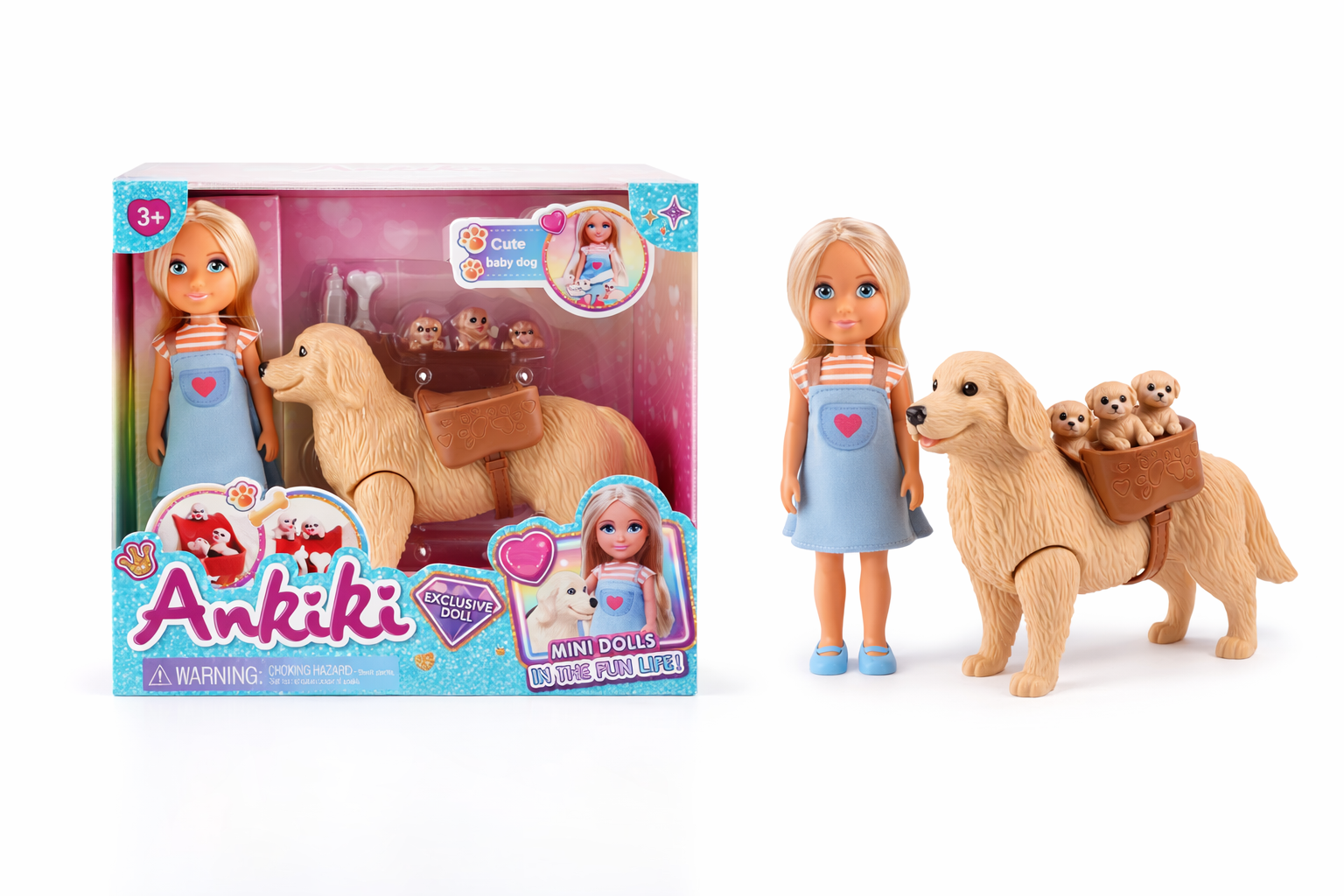 Dieses bezaubernde Puppenspielset von Ankiki bietet endlose Spielmöglichkeiten für Kinder ab 3 Jahren. Die 5-Zoll-Puppe trägt ein buntes Outfit mit einem niedlichen blauen Kleid und Herz-Design. Zusammen mit einem großen, detailgetreuen Hund und drei kleinen Welpenfiguren entfaltet sich eine fantasievolle Spielwelt. Das Set fördert kreatives Rollenspiel und soziale Fähigkeiten, während Kinder die Puppe durch Abenteuer mit ihren vierbeinigen Freunden begleiten. Die hochwertigen, unbedenklichen Materialien sorgen für sicheres Spielvergnügen, während die Farben und das Design die Fantasie der Kleinen anregen. Perfekt für drinnen und draußen und ein tolles Geschenk für kleine Tierfreunde!